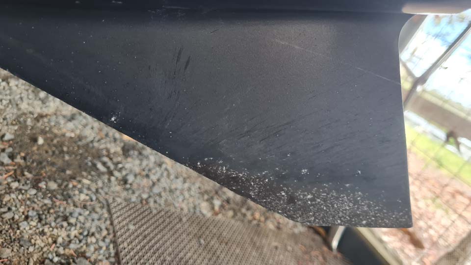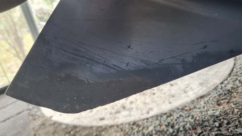 The hydrofoil on the cavitation plate is the clamp on type (no holes in the cavitation plate) and will be removed and reinstalled on the new motor. It is not part of this sale.